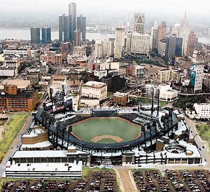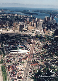 Tiger Stadium - Opening day, looking east. In the background is the RenCen (tallest building on right) bought by GM to become their new world headquarters. Belle Isle, the Detroit River, and Lake St. Clair are beyond. The downtown area is coming alive with major construction projects, including two new stadiums and three casinos. |