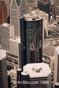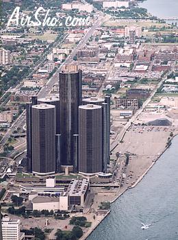 The Renaissance Center - General Motors will soon put their sign atop this showpiece in downtown Detroit. Real estate estimates are GM shrewdly paid less than 20 cents on the dollar for a building that was built by the late Henry Ford II in the 70's. You're looking at the tallest building in Michigan. On the choicest property in Detroit, the riverfront, it's surrounded by several smaller towers which today house many Ford Motor Company operations. |